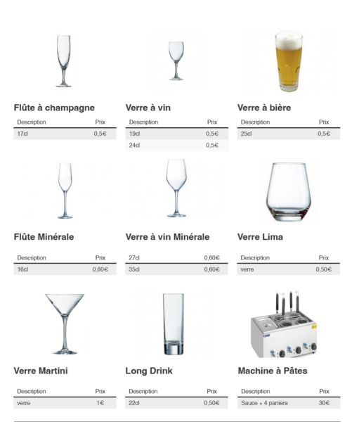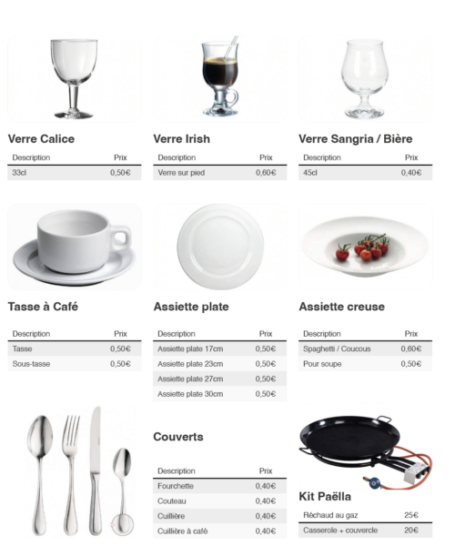 La vaisselle se loue par « rack » complet dont voici les quantités :